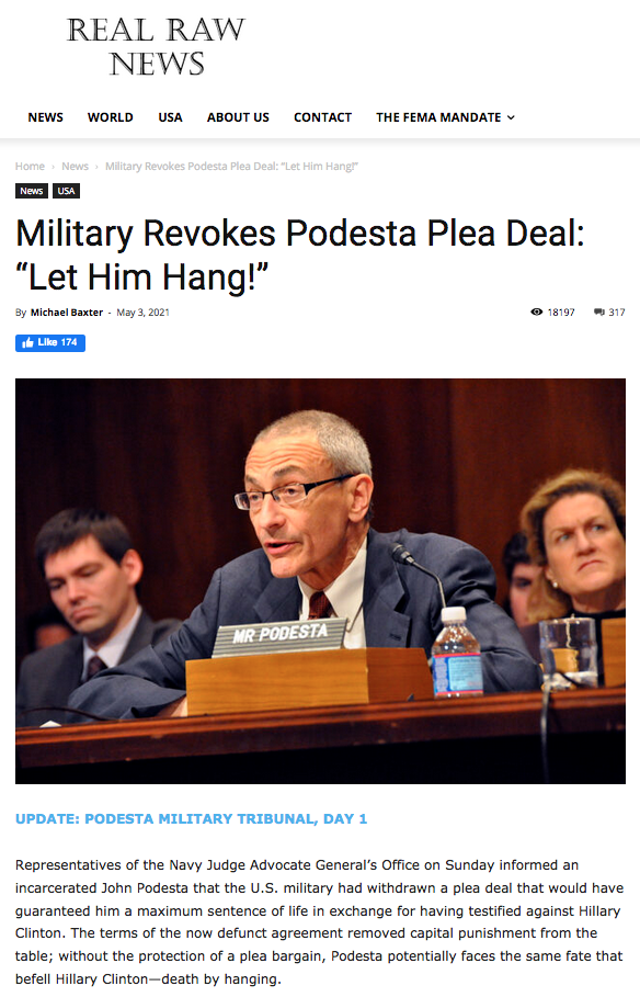 Even a cursory perusal of the numerous articles posted at Real Raw News indicates that this fake news site is funded and staffed by agents of the CIA’s Mockingbird Media. And, all anyone has to do is read one article such as this post to understand how utterly ludicrous the content really is: Military Revokes Podesta Plea Deal: “Let Him Hang!”. However, in spite of so much obvious falsehood, it is still believed by millions of truth-seeking Patriots.