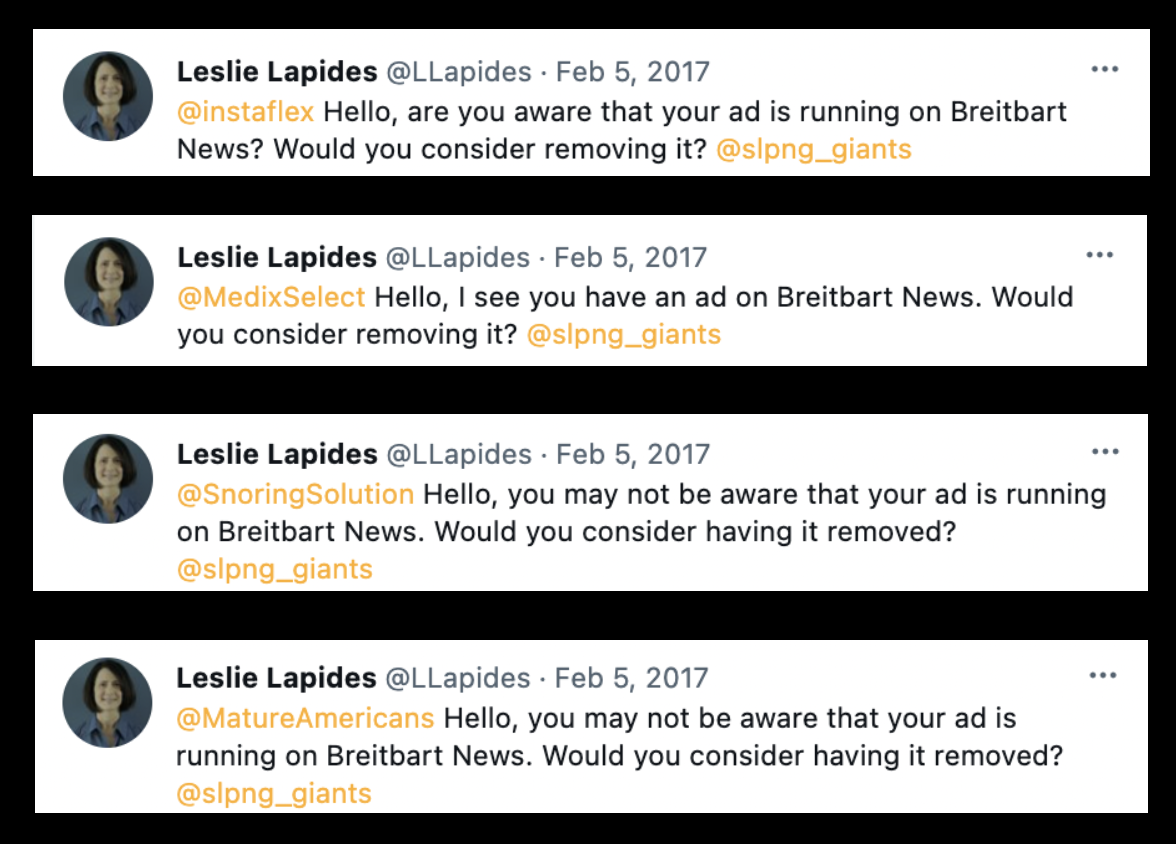 On February 5th, 2017, she shared four posts encouraging Instaflex, Medix Select, Snoring Solution, and the Association of Mature American Citizens to halt their advertisements running on Breitbart. “Hello, are you aware that your ad is running on Breitbart News? Would you consider removing it,” she wrote before tagging Sleeping Giants.